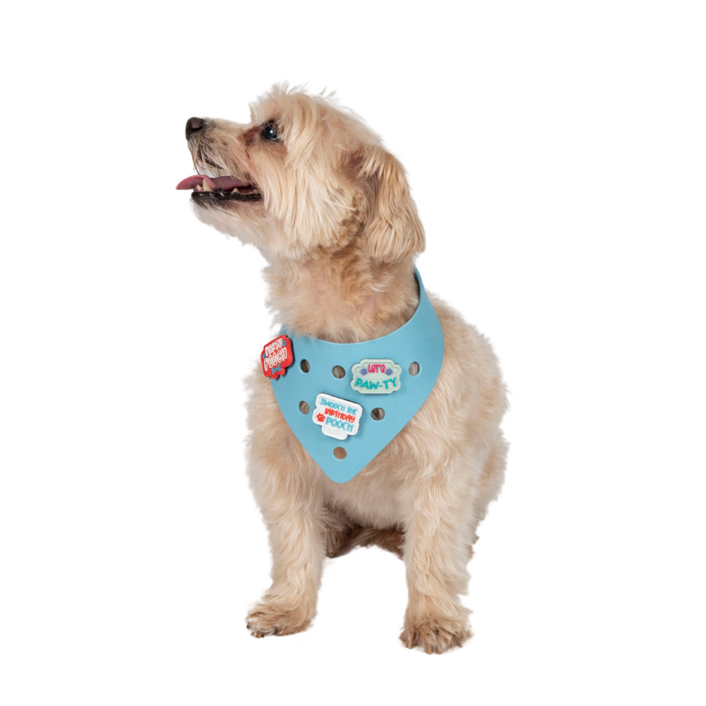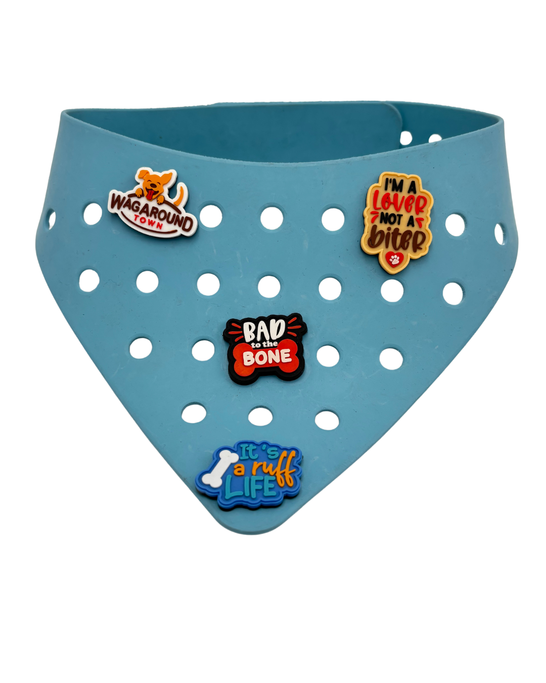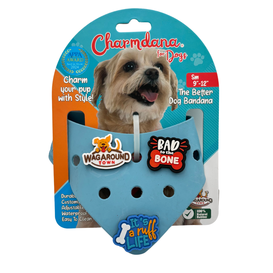 Introducing Charmdana: Canine fashion elevated! With vibrant colors and eye-catching charms. This all-natural rubber dog bandana with charms is perfect for pups with busy, messy lives.